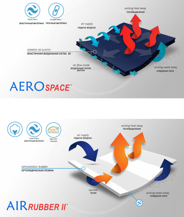 Изделие не теряет эксплуатационных качеств после чистки и стирки и вполне пригодно для длительного использования в сложных условиях. AirRubber II™ очень хорошо пропускает воздух, характеризуется односторонней эластичностью, имеет перфорацию, позволяет коже «дышать» и хорошо отводит пот. Кроме того, переплетения нитей резины при более сильной компрессии создают микромассаж кожи. Материал приятный для кожи.
