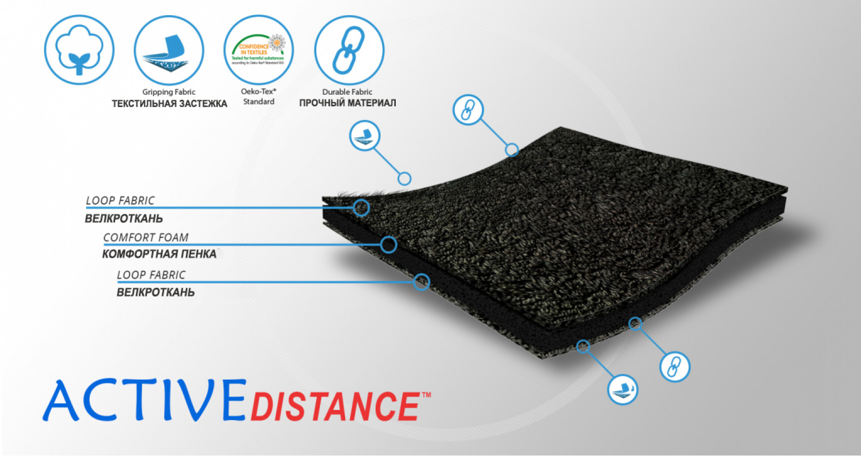 Ортез изготовлен из материала ActiveDistance – трехслойного сырья, состоящего из неэластичной полиамидной ткани с 2 сторон и комфортной пены между ними.