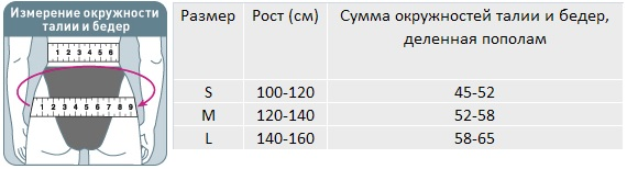 Для правильного выбора размера детского корректора осанки Orlett TLSO-250(P) необходимо сантиметровой лентой измерить окружность талии и бедер. Далее их сумму поделить пополам и воспользоваться таблицей, представленной ниже: