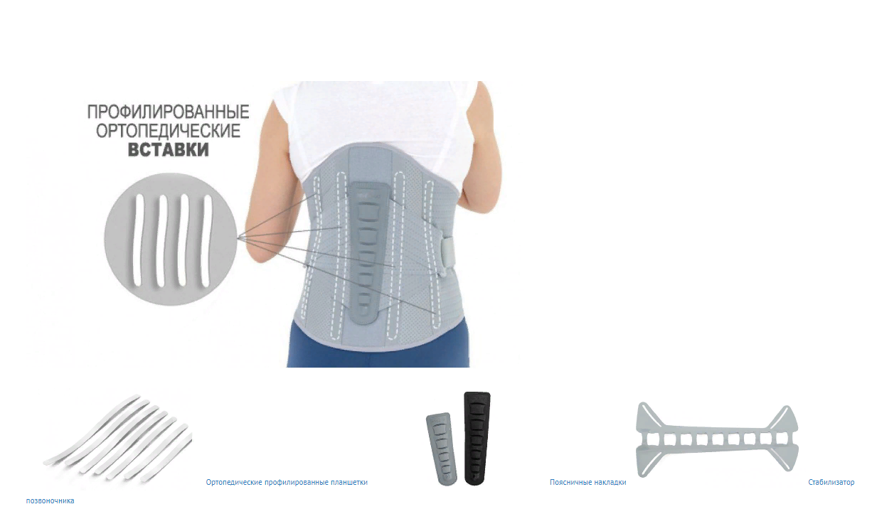 Благодаря съемным стабилизаторам корсет может быть использован на разных этапах реабилитации. На последних этапах возможно использования корсета без съемных частей
