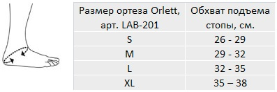 Для правильного подбора голеностопного ортеза Orlett LAB-201 необходимо измерить сантиметровой лентой (плотно, но не утягивая) обхват подъема стопы. Выбрать размер в соответствии с таблицей: