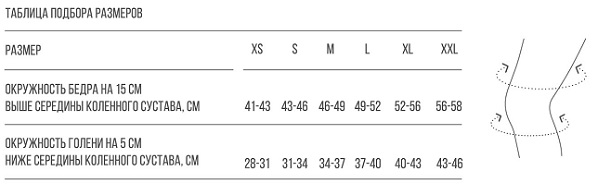 Для выбора подходящего размера ортеза на коленный сустав Orlett Genu Flex DKN-203 необходимо измерить сантиметровой лентой (плотно, но не утягивая) окружность бедра на 15 см выше середины коленного сустава, и окружность голени на 5 см ниже середины коленного сустава. Далее в соответствии с таблицей подобрать подходящий размер: