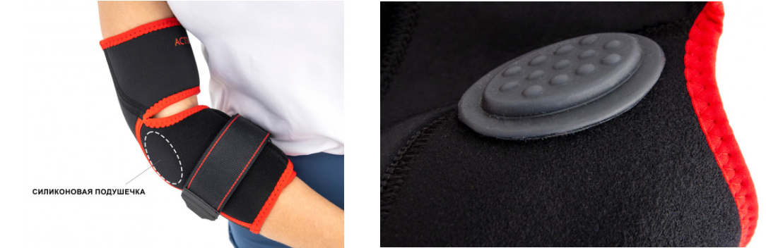 Съемная силиконовая подушечка оказывает компрессионное давление на место прикрепления сухожилия, тем самым уменьшая боль. Может крепиться с внутренней или внешней стороны сустава
