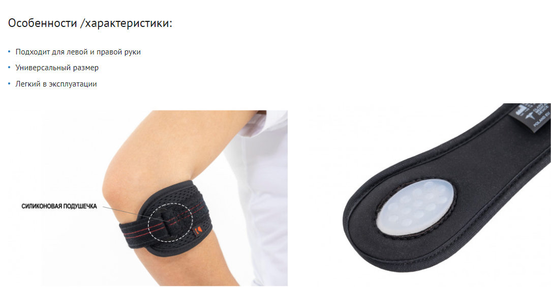 Инновационная конструкция ортеза AM-LX-02 позволяет силиконовой подушечке концентрировать давление на мышцах и сухожилиях, затронутых этим заболеванием. Подушечка создает давление на места крепления проксимальных разгибателей и сгибателей предплечья и кисти. Уменьшает риск перегрузки и надрыва сухожилий, а в случае травмы облегчает и ускоряет заживание. Силиконовая подушечка предназначена для микромассажа во время ношения бандажа. Полиамидная пряжка регулирует силу давления.